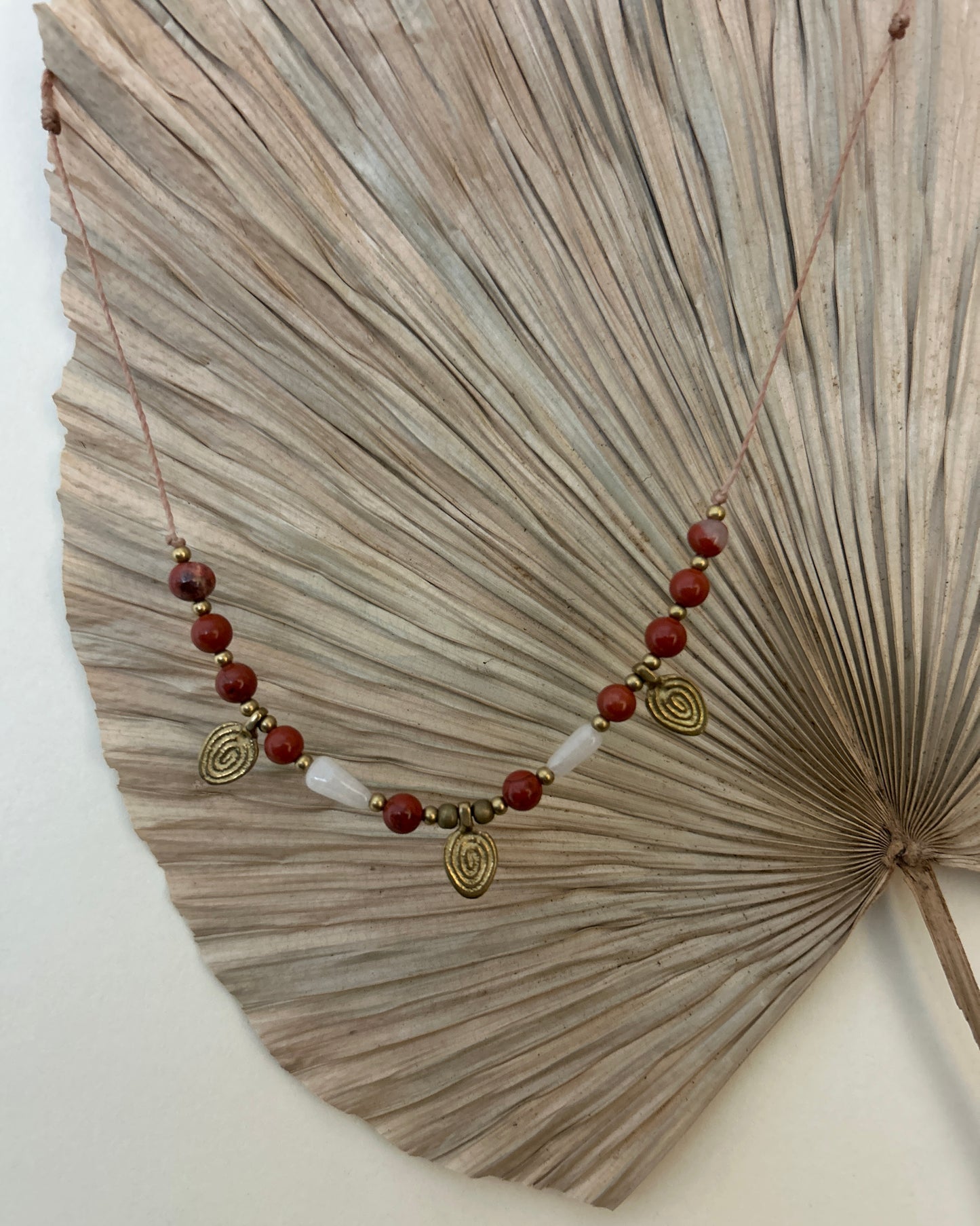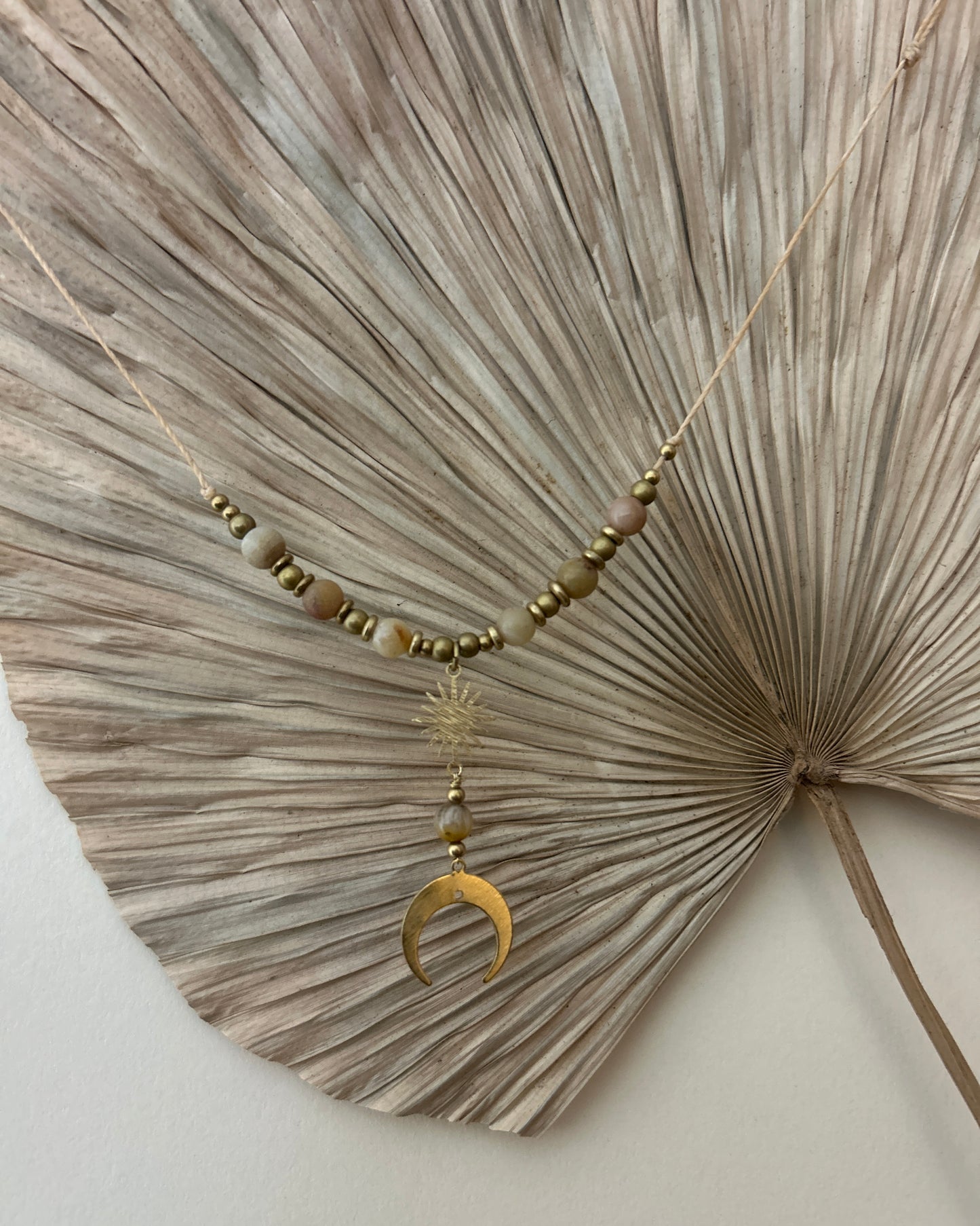 Each necklace is a lovingly handcrafted unique piece. The pieces of jewelry are mostly upcycled. The yarn is made of vegan waxed polyester and is 2nd hand. We use second-hand beads, real gemstone mala beads or glass beads made from components of old necklaces, bracelets, etc.